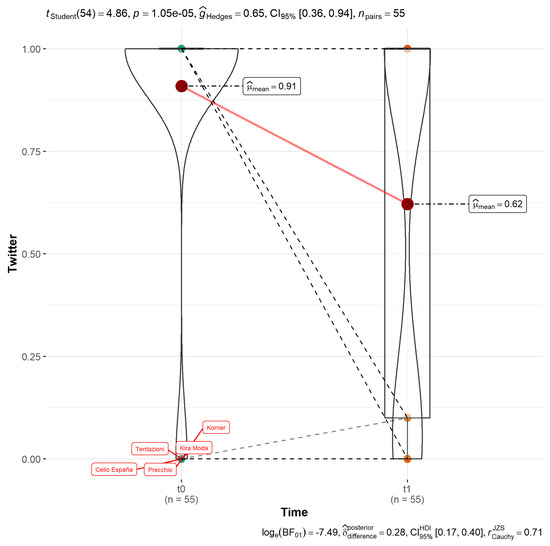 Finally, the analysis showed significant drops in the use of some social networks, such as Pinterest and Twitter (Figure 4 and Figure 5), and we observed a significant increase in the use of WhatsApp. While the formulation of H4 would suggest that an increase in the use of Instagram might be expected, the analysis shows no significant differences, but this result is conditioned by the fact that all companies were already using this communication channel before the pandemic. Regarding other digital services, McNemar’s test shows a significant increase in the use of online billing services (p-value = 0.031), a service that 46 retailers offered before the pandemic, but is now offered by all 51 retailers included in the data set. We also observed differences in the implementation of WhatsApp as a communication channel, but its significance is only marginal (p-value < 0.05, one-sided; p-value = 0.07, two-sided) as no direction of change was proposed.