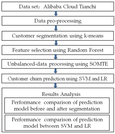 7], by comparing prediction models, such as LR, SVM, Neural Network, Decision Trees, and Random Forest, the research results show that the SVM model exhibited a positive prediction performance with a quick training speed. Therefore, considering the obvious advantages of the k-means and SVM algorithms, we chose the k-means and SVM as the main algorithms in this paper and made a comparative analysis through LR. On the basis of pre-processed data, this study first uses the k-means algorithm for the clustering subdivision of customers and then uses the LR algorithm and SVM algorithm to establish prediction models. The prediction accuracy and effectiveness of these two prediction models are investigated, and a comparative analysis is conducted. The research process is shown in