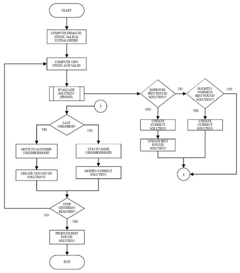 Initially, starting from the sales forecast, a random demand is calculated within the range defined by Equation (3). A random order is determined as the current solution, and Equations (2) and (4) define the sales and inventory, respectively, for the first solution. This first solution will serve as a starting point to create a set of solutions (neighborhood: set of neighbors). All neighbors in a neighborhood are constructed from percentage variations of the order values. Such variation can be incremental or decremental within a range of 0 to 40%. It must be noted that a solution consists of the inventory of each type of product allocated to each channel in each of the periods considered.