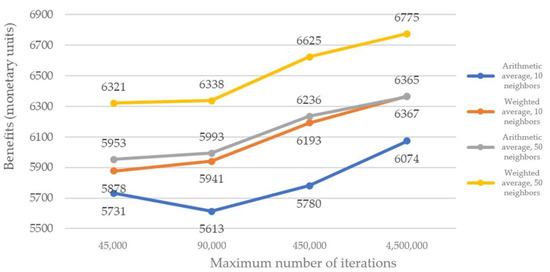 Figure 2, we always obtained better solutions with the weighted average than with the arithmetic average (Equations (10) and (11), respectively), for both neighborhoods of 10 and 50 neighbors. Therefore, it is evident that when the generation of a new set of solutions has a strong influence on the best solution found so far (weighted average), a higher profit is achieved. On the other hand, this profit is smaller when the solution generated has a greater dependence on randomness (arithmetic mean). The positive point of randomness is that it allows a larger number of different neighborhoods to be tracked.
