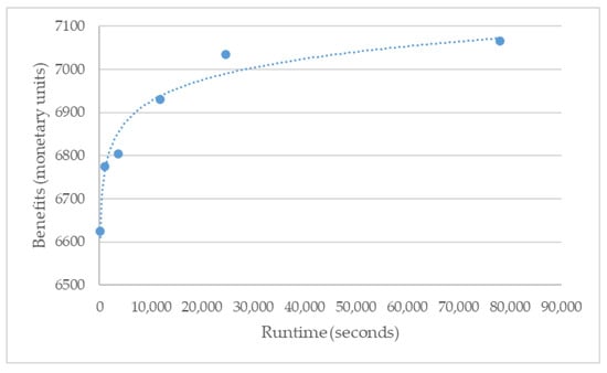 Figure 3 indicates that the benefits do improve with time but tend to stabilize after several hours of runtime, following a logarithmic pattern. The dotted line included in the graph represents a logarithmic trendline, which closely adheres to the evolution of the benefits. All the cases studied for different parameter values were repeated up to five times in order to take an average value, and thus obtain a more representative result.