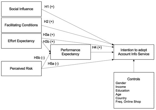 Given the relative novelty of PSD2, empirical research on behaviour intention and usage behaviour with respect to AIS is limited. AIS assumes the sharing of customer account data with other banks and third party providers, while there are numerous articles that suggest privacy and security concerns will be significant barriers to AIS adoption, there are few published empirical studies. In a study of Dutch consumers, Bijlsma et al. [] find that propensity to use AIS is driven by trust in the providers of these services, while respondents suggested that their preference was to share data with their own bank, the decision to allow others to use financial data, for examples for loan approval, is influenced by financial incentives []. As such, it would seem that the price value trade-off matters when it comes to AIS adoption and usage, while the [] study has a substantial sample of Dutch consumers, the Dutch internet and mobile banking market is significantly more advanced than other European markets [,] and as such findings of [] may not be representative of the wider European experience. Consequently, and given the paucity of empirical research on consumer attitudes towards AIS, the importance of the European banking market, and the international impact of PSD2, this paper is timely and is one of the first papers to empirically examine intention to use AIS across multiple European countries.