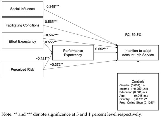 All control variables were not significant with the exception of country and frequency of online shopping which had a positive influence on intention, meaning more experienced online shoppers were more likely to adopt account information services. Perceived risk also had a negative relationship with performance expectancy ( = −0.121, 0.001), and effort expectancy had a positive relationship with performance expectancy ( = 0.555, 0.001).