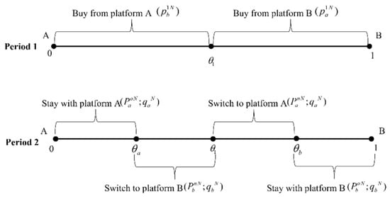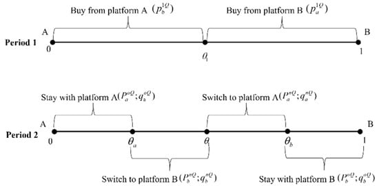 Users’ decisions. Figure 3 depicts the consumption pattern with quality discrimination. For the users who purchase from platform A in the first period, i.e., (as shown in Figure 3), the utility they obtain from staying with platform A is , and the utility they gain from switching to platform B is . Letting the two utilities be equal, we can get the marginal users’ location, i.e., . Similarly, for those users who buy from platform B in the first period, i.e., (as shown in Figure 3), the utility they get from continuing to choose platform B is , and the utility they receive from switching to platform A is . Letting these two utilities be equal, the marginal users are obtained, i.e., .