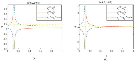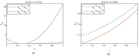 Proposition 5 also shows that, when the market competition is strong, with the increase of users’ privacy cost, the revenue from quality discrimination is always lower than that without quality discrimination. This is because, as shown in Figure 4, the uniform quality set by platforms for all users without quality discrimination is slightly higher than that set by firms for new and old users with quality discrimination. With the increase of users’ privacy cost, higher quality product can attract more users. Therefore, compared with adopting quality discrimination, platforms can obtain more profits without quality discrimination.