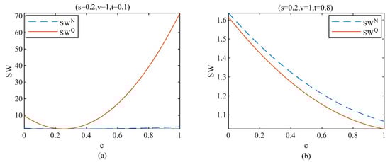 Figure 7 presents our numerical results of Proposition 5 and how the social welfare is affected by the privacy cost, i.e., and competition intensity, i.e., . Figure 7a demonstrates that, when the competition intensity is weak, with the privacy cost, the social welfare under quality discrimination declines first and then increases, while the social welfare without quality discrimination shows a slightly upward trend. However, there is always the higher social welfare under quality discrimination. Figure 7b depicts that, when competition intensity is strong, social welfare decreases with the privacy cost. In addition, the social welfare is greater without quality discrimination. Proposition 5 shows that, when competition intensity is weak and there is quality discrimination, social welfare goes up as users’ privacy cost increases. However, when the competition intensity is strong, whether there is quality discrimination or not, with the increase of users’ privacy cost, the user surplus always declines.