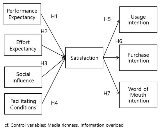 Originally, they argued that four independent variables directly influence behavioral intention in the UTAUT. However, according to the TPB (theory of planned behavior) referred to in the UTAUT, it is argued that the cognitive and affective perception of information system users first forms an overall attitude toward the information system and then affects the behavioral intentions [76]. Therefore, it is reasonable to judge that these four independent variables influence the formation of attitudes of information system users and then affect behavioral intentions. One of the most widely used variables among attitudes is the overall satisfaction that information system users feel about using the information system [77]. Service satisfaction is defined as the overall positive evaluation of toward the service usage by users [78]. When users could feel positive about their experience using the information system, they could be satisfied with the information system usage and continue to use the information system to keep their positive experience [77]. Consumers’ purchase intentions are influenced by satisfaction [78,79]. When users are satisfied with the information system, they want to return the corresponding value to the information system service provider [80]. In this case, they could spread positive word of mouth, sharing their positive experiences with others [80].