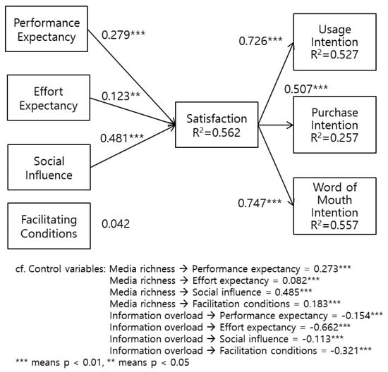 I performed structured equation model analysis using the PLS algorithm and calculated the path coefficients and significances between variables to verify my hypotheses. Path coefficients between performance expectancy and satisfaction (H1, β = 0.279 ***), between effort expectancy and satisfaction (H2, β = 0.123 **), between social influence and satisfaction (H3, β = 0.481 ***), between satisfaction and usage intention (H5, β = 0.726 ***), between satisfaction and purchase intention (H6, β = 0.507 ***), and between satisfaction and positive word-of-mouth intention (H7, β = 0.747 ***) were significant. Therefore, all the above hypotheses were significantly approved. However, the path coefficient between the facilitating condition and satisfaction (H4, β = 0.042) was not significant, and H4 was rejected. Figure 2 shows the PLS analysis results, which show the path coefficients and p-value of each path.