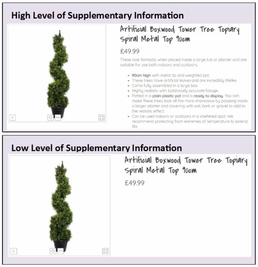 Textual information in studies considered books when “extensive and higher-quality” may affect consumer satisfaction [,] and increase purchase intention. The research indicates that for some products the use of textual information increases purchase intention, whereas for others it reduces it due to information overload. Since purchases which are more expensive would arguably require a higher level of commitment to buy, this may be affected by the amount of information available to make the decision. Limited research has been conducted regarding home décor products and the effect that supplementary information has on purchase intentions.