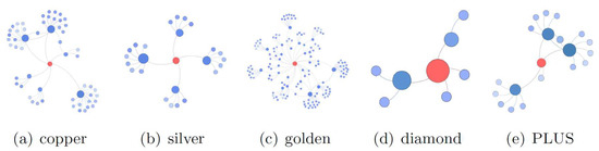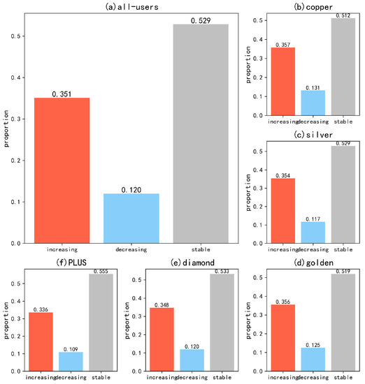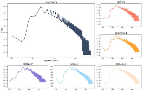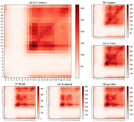 Figure 4b–f, it can be further observed that the same patterns of periodic intervals for silver and golden levels are closer to those for all users. However, the patches in grids for diamond users and PLUS users are relatively disarrayed, lacking a regular pattern of gradual change. Therefore, it can be summarized that the online interactive behavior, such as purchasing and posting reviews, of users with higher levels can be triggered in a more random manner, especially compared with that of users at lower levels. This can be well explained by the more frequent purchases and more active interactions of higher-level users.