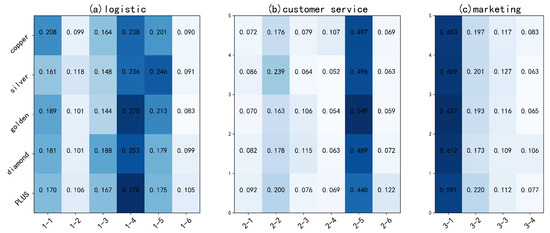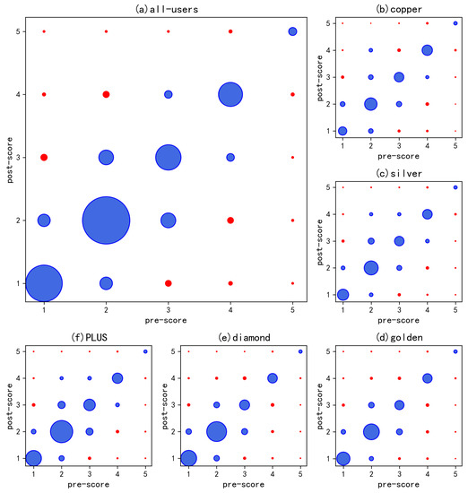 Figure 11b–f suggests that users from upper levels have a stronger momentum in negative emotion than those of lower levels, as the sizes of the diagonal bubbles become larger as the user level increases. For every threshold in [0.5, 1, 2, 24], we obtained the same conclusion, as a promise of robustness. In contrast with the conclusion above that the upper-level users are less emotional, a more intensive momentum in negative emotion indicates that although upper-level users have richer sets of experiences and more stable emotions, once they are faced with an unsatisfactory experience, it will cost more for sellers to comfort them and alleviate the negative outcomes.