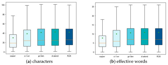 Figure 7 shows the distribution of negative review length for five user levels, in which both methods were employed with the same performance. Considering most of the outliers come from the deliberate repetition of meaningless words and increase the difficulty of viewing and comparing among user levels, fliers are ignored here. It can be seen that with the increase in user level, the negative review length has an upward trend. Moreover, the upward trend is statistically significant in the one-way