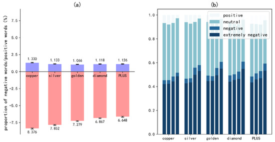 Figure 10a shows the average percentage of positive and negative emotion words in negative reviews posted in 2017. As can be seen, the degree of negative emotion decreases as user levels increase, while there is no evident trend in positive emotion. Interestingly, golden users have the lowest positive words usage, and copper users deliver the highest degrees of both positiveness and negativeness. It can be summarized that consumers from upper levels are usually less emotional than those of lower levels. The results may be explained to agree with our expectation, as consumers from upper levels have more experience in product selection and negotiation with sellers, leading to being less emotional but more rational. The results of the other years, from 2013 to 2016 (seen