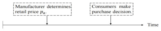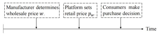Under the wholesale selling scheme, the platform resells the products bought from the manufacturer to consumers. The sequence of events under the wholesale selling scheme is illustrated in Figure 1 and described as follows: the manufacturer first determines the product’s wholesale price , the platform then lays down the product’s retail price , and, finally, consumers make their purchasing decisions. Under the agency selling scheme, an upstream manufacturer can sell the product to consumers through the platform. This selling scheme is widely used in the digital publishing industry [43] and the online travel industry [54]. The sequence of events under the agency selling schemes is illustrated in Figure 2 and described as follows: the manufacturer sets the retail price and pays a platform fee to the platform per unit sold, and then consumers make their purchasing decisions. Such a kind of a constant fee contract is also widely used in previous studies, such as Zhang et al. [5], Jiang et al. [56], and Mantin et al. [57]. Throughout this paper, to make all members participate in the supply chain, the platform fee is not too large; that is, . Similar to Hao and Fan [43] and Tan and Carrillo [44], Section 6.2 investigates a case in which the platform fee is a proportion of the selling price in the agency model. We show that the main insights derived from the baseline model remain robust under a proportional platform fee. Moreover, Section 6.4 discusses the situation where the platform fee is an endogenous variable that is determined through negotiations between the manufacturer and platform. We find that the main insights remain qualitatively unchanged.