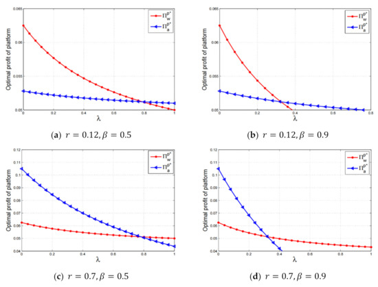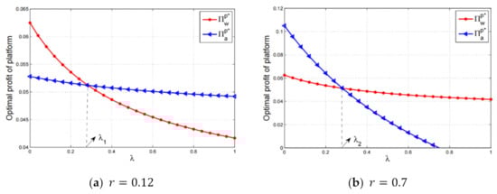 where and are the profits of manufacturer and platform under the agency selling scheme, respectively. Based on the results shown in Lemma 2, the optimal profits of the manufacturer and the platform are and , respectively. According to the first-order condition, we obtain that