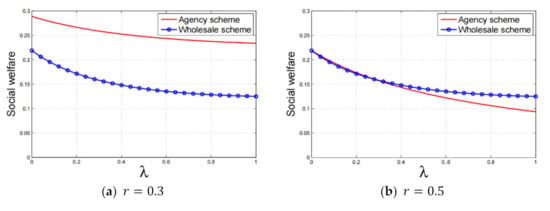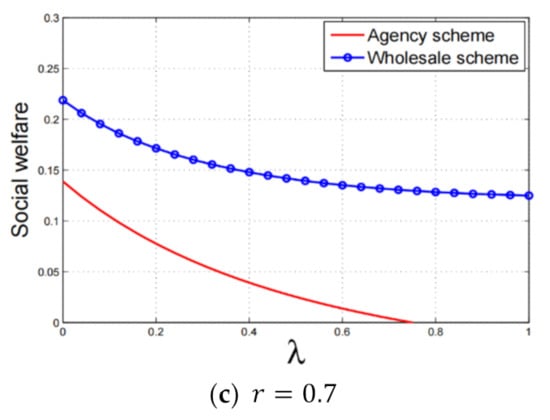 When the platform uses the wholesale selling scheme, the positive monetary payoff for the consumer is , where is a reservation value and is a retail price determined by the platform. Following Yi et al. [19], Harutyunyan et al. [39], and Ho et al. [58], the reservation value is uniformly distributed between 0 and 1. When the platform adopts the agency selling scheme, the positive monetary payoff for the consumer is , where is a reservation value and is a retail price determined by the manufacturer [59].