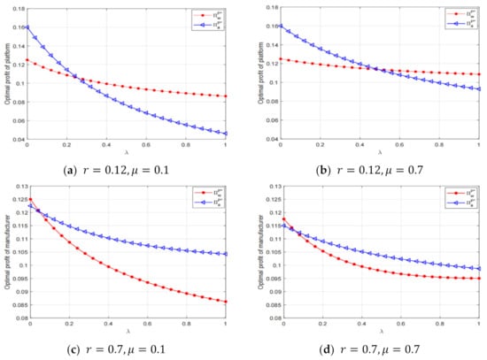 - The profits of the manufacturer and the supply chain system decrease with the platform fee . However, there exists a threshold value for the platform fee . If the platform fee is lower than the threshold value (i.e., ), the profit of the platform increases with , whereas, if the platform fee is higher than the threshold value (i.e., ), the profit of the platform decreases with .