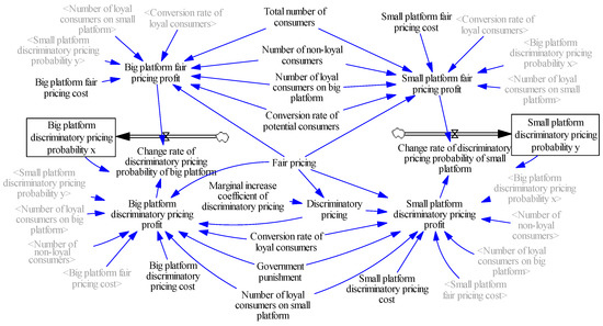 Similarly, the System Dynamics model with the collaborative supervision of the government and the third party is constructed, as shown in Figure 9, and numerical simulation is carried out to explore the evolution process of the big platform.