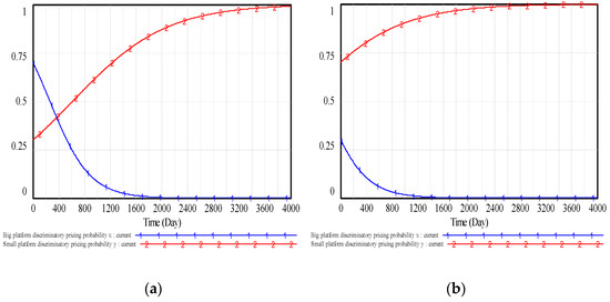 In Figure 1, two rate equations (change rate of discriminatory pricing probability of big platform and small platform) are the same as Equations (4) and (5), two profit functions (big platform discriminatory pricing profit and small platform discriminatory pricing profit) are the same as , and . The magnitude selection of initial parameter values does not affect the results of the evolutionary game. Under the premise of satisfying , , , , and , this paper analyzes the impact of different values of the additional profit (), the profit loss (), and the government punishment on the system stability. The initial proportion pair has nothing to do with the result of equilibrium. Consider two situations corresponding to two pairs of the initial proportions of big platforms and small platforms that choose discriminatory pricing as . Then the numerical simulation is carried out using Vensim software to explore and verify the evolution trend for the pricing behavior of the two platforms under the government supervision mechanism in four cases mentioned in Section 3.3. Therefore, the government punishment is mainly changed here.