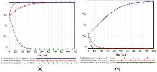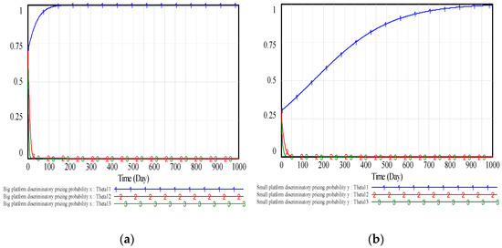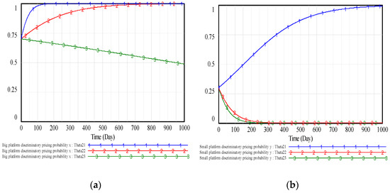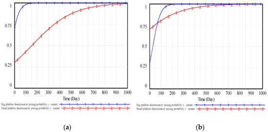 Figure 6 shows that with the increase of the government punishment coefficient , the rate of both types of platforms choosing discriminatory pricing is slowed down and will finally be zero, so the government punishment has important affection on discriminatory pricing. Combine (a) with (b), the results show that both types of platforms will finally choose a fair pricing strategy (discriminatory pricing strategy) when the government punishment coefficient is large enough (too small), corresponding to the case (), that is, the government punishment on the discriminatory pricing of the platform is greater (less) than the extra net profit that each platform obtains from the discriminatory pricing. When the government punishment coefficient is moderate, corresponding to the case , that is, the government punishment on the discriminatory pricing of the platform is greater than the extra net profit that the small platform obtains from the discriminatory pricing but less than the extra net profit that the big platform obtains, the big platform will choose discriminatory pricing strategy, and the small platform will choose fair pricing strategy.