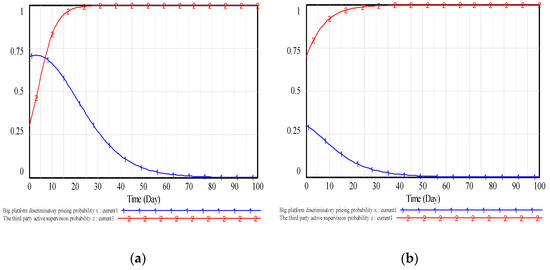 As can be seen from Figure 10, in the early stage, there exist some big platforms implementing big data discriminatory pricing because the government punishment is not large enough to offset the extra net profits brought by the discriminatory pricing. But when the more third-party supervision agencies adopt the active supervision strategy, the more the big data discriminatory pricing behaviors of the big platform will be frequently exposed and reported by the third party, and more big platforms will turn to adopt the fair pricing strategy in consideration of the loss of reputation and profits. Finally, the system evolution stability equilibrium tends to , which means that the big platform will choose the fair pricing strategy, and the third party will adopt the active supervision strategy.