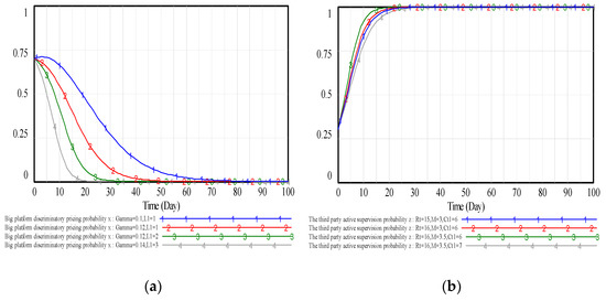 As can be seen from Figure 11a, the government punishment coefficient and reputation loss are both negatively correlated with the probability of the big platform who perform the big data discriminatory pricing, so the combined effect of government punishment and reputation loss accelerates the evolution speed of the big platform from discriminatory pricing to fair pricing. As can be seen from Figure 11b, the probability of the third party who choose active supervision is promoted by fixed service fees and social reputation , while bearing the negative affects of the active supervision cost . The difference between positive effect and negative effect affects the behavior of the third party. There exists one positive feedback that the more motivated the third party is to supervise and expose the big data discriminatory pricing behavior of big platform, which actively safeguards the legitimate rights and interests of consumers, then the third party improves its image and obtains more benefits, which in turn promotes the third party to supervise big platform actively.