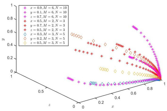For and , the stability strategy of the system corresponds to the equilibrium point ; that is, the CEs and SMZEs tend to be non-repayment and trustworthy, respectively, when FI prefers supply chain finance using BTs. For a relatively large accounts receivable, the CEs can obtain a relatively large income from delayed payment of accounts receivable, which would make it impossible to make the repayment chosen by the CEs in time. Meanwhile, a relatively large accounts receivable, which is greater than the principal and interest of a loan from FI, can constrain the choice of the SMZEs to be trustworthy.