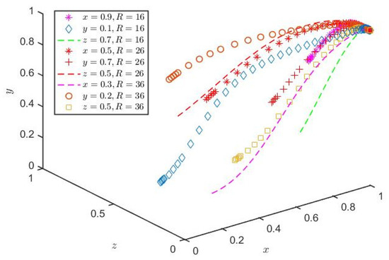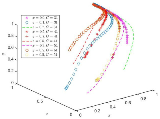 From the above results, for the conditions and , the stable strategy of the system corresponds to the equilibrium point . Specifically, the financial institution prefers supply chain finance using BTs, and CEs and SMZEs tend towards non-repayment and default, respectively. From the results, it can be seen that, for the smaller non-repayment and default losses, and simultaneously, the CEs and SMZEs tend to break their promises in the financing process.