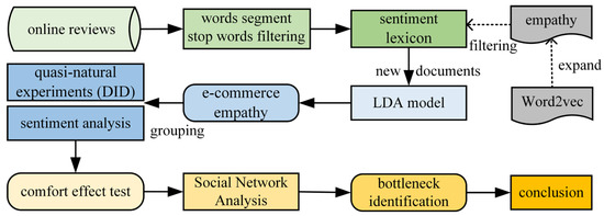 According to the research question and hypothesis, the study can be divided into three parts: characteristic insights into “e-commerce temperature”, examination of “comfort” effects, and the identification and breakthrough of possible bottlenecks. Firstly, the raw text materials were collected by using web crawler technology and important e-commerce service elements were obtained by word frequency analysis after data pre-processing such as word segment and stop word filtering of online reviews. Since this paper only focuses on online texts related to “e-commerce temperature”, words related to empathetic connotations were selected and mapped using Word2vec to form a “temperature” sentiment lexicon. Secondly, the new dataset was analyzed by the LDA topic model to obtain the characteristics of “e-commerce temperature”, which was used as a basis for grouping in a quasi-natural experiment with the DID model to test the mechanism of “e-commerce temperature” on consumer satisfaction during the pandemic. Finally, if there was a certain bottleneck that the “comfort” effect could not significantly alleviate consumer discontent when satisfaction was at a low level [8], negative online reviews with the satisfaction less than the significance threshold were screened. Then, the bottleneck could be identified depending on the centrality and frequency, which could reveal relevance and importance of the nodes (words) by using social network analysis, and the breakthrough means were proposed accordingly. The research framework is shown in Figure 1.