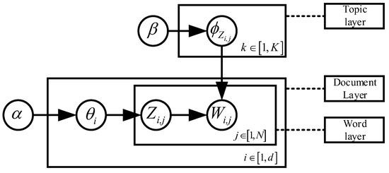 The LDA topic model is an unsupervised clustering algorithm capable of giving document topics in a distributed form. In the model, the process of document generation is shown in Figure 2.
