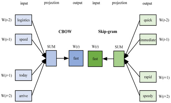 Distributed sentiment analysis, which can achieve better prediction results, refers to the pre-training of semantic similarity before machine learning training. Word2vec is a word embedding method proposed by MIKOLOV in 2013, which can compute a distributed word vector for each word in the text [34]. The vector dimension is reduced by replacing the implicit layer in the neural network with a quadratic approach, which has a higher rate and better model accuracy for the same sample size when training large samples. Word2vec has two training models, Skip-gram and CBOW (Figure 3, w(t) is the tth word), which can both consider textual scenarios to calculate semantic similarity. The difference is that the former predicts synonyms by a single word, while the latter predicts central words by the top and bottom words and has better model accuracy in large samples; thus, the CBOW model is used for model training in this paper.