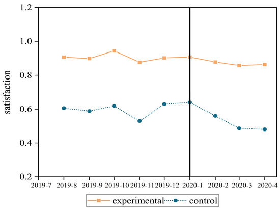 A parallel trend is a premise and basic assumption of the DID model, which requires that the experimental group and the control group have the same trend of change before the exogenous shock. There are various ways to achieve parallel trend testing, among which the time-varying trend of the dependent variable best visualizes the difference between groups before and after the event [37,38]. Therefore, this paper takes January 2020 as the cut-off point of the pandemic shock, takes the month as the basic unit to calculate consumer satisfaction according to the time series, and plots the time change trend of satisfaction between the control group and the experimental group (Figure 6).