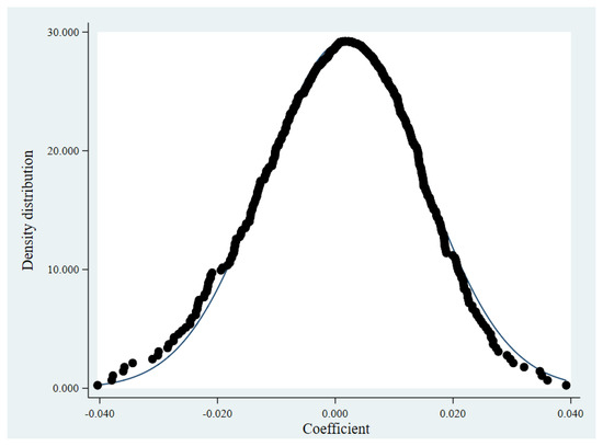 Different e-retailers have different characteristics, and although the price, retailers’ reputation, and size are selected as the control variables of the model, there are still some unobservable and unidentifiable variables that can affect and perturb the model over time [39,40]. Based on this, the paper randomly selects an experimental group to test whether the slowdown of decreased satisfaction is caused by the “e-commerce temperature” during the pandemic. Specifically, 252 pseudo-experimental groups were randomly selected from 586 observations, and the random sampling process was iterated 500 times and cross-multiplied with a time dummy variable for regression analysis.