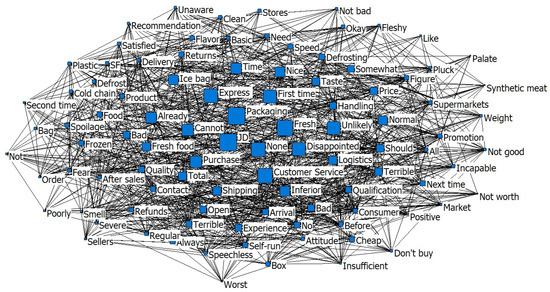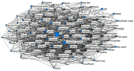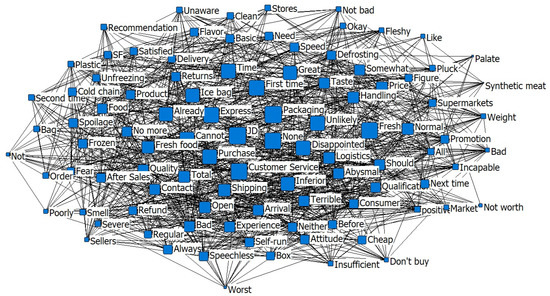 According to the results of the quantile regression in Section 4.2.1, there is a bottleneck of “comfort” in the low level of consumer satisfaction for “e-commerce temperature”. To further improve consumer satisfaction and find the pain points of fresh food e-commerce during the pandemic, this paper screens out the negative reviews (satisfaction less than 0.3) and uses social network analysis to dig out the factors that result in consumer dissatisfaction. A co-occurrence matrix with a word frequency higher than 10 is built with the help of python, and three kinds of centralities of fresh food e-commerce are analyzed by Ucinet (Table 8).