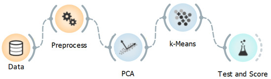 - Gorup, Č; Demšar, J.; Curk, T.; Erjavec, A.; Hočevar, T.; Milutinovič, M.; Možina, M.; Polajnar, M.; Toplak, M.; Starič, A.; et al. Orange: Data Mining Toolbox in Python. J. Mach. Learn. Res. 2013, 14, 2349–2353. [Google Scholar]