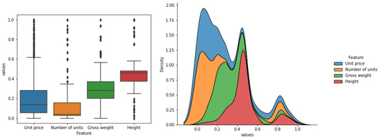 Table 2 provides descriptive statistics, including measures of central tendency, dispersion, and quartiles. Figure 3 sheds light on the shape of the feature’s distribution by presenting the box plots and kernel density estimation plots. The kernel density estimation plots are produced by applying kernel smoothing to estimate the probability density function of the empirical data. Such an illustration immediately provides critical insights into the data structure. Such features as “unit price”, “number of units”, and “gross weight” are heavy-tailed and multimodal (trimodal to be more specific).