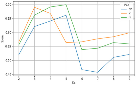 The pipeline with three principal components and five clusters demonstrated the highest performance (Silhouette score of 0.699). Additionally, five clusters appeared to be optimal even when PCA had not been applied. However, such a pipeline performed notably worse (Silhouette score of 0.662). The pipeline with two principal components and three clusters could be considered as an alternative with the second best performance (Silhouette score of 0.690). Table A1 contains the Silhouette score values for every pair of pipeline parameters obtained through the grid-search procedure.