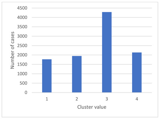 As discussed in the methodology section, the independent variables were divided into continuous and categorical variables. The categorical variables included gender, education level, marital status, income category, and product variable. The rest of the independent variables were continuous. The categorical variables were forwarded to the two-step clustering model to merge the variables into one categorical variable that described all the categorical variables in the dataset. The results showed that the two-step clustering approach can create four categories for the input variables, as shown in Figure 3. The generated clusters are used with the k-nearest neighbor model to ensure that the developed model is similar to the real environment; here, k is the number of clusters generated using two-step clustering, as shown in the study methodology. The predicted values were used in the three datasets to validate the capability of the k-nearest neighbor model in predicting cluster values using the categorical variables. The accuracy results of the training, testing, and validating datasets were 0.93, 0.94, and 0.95, respectively. The results from the k-nearest neighbors approach indicated that the model is capable of predicting the generated cluster value using the categorical value.