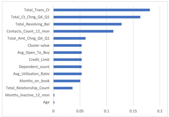 To merge the collected results and the studied variables, the importance of each variable applied in the C5 tree model is shown in Figure 4. The results revealed that the top three variables in building the C5 tree prediction model were total transaction count, total revolving balance on the credit card, and change in transaction count; here, age- and month-inactive variables were very weak variables in building a C5 tree prediction model. In addition, the new cluster value generated in Model 2 was found to be among the top six most important variables in developing the customer churn prediction model.