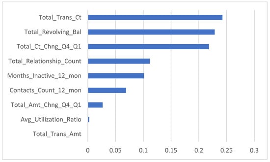 To merge the collected results and the studied variables, the importance of the variables included as independent variables is shown in Figure 2. The importance of each variable analysis revealed that the top three variables were: change in transaction count, total revolving balance on the credit card, and total transaction count. Here, open-to-buy credit lines and the total transaction amounts showed very weak relations in building the C5 tree prediction model.