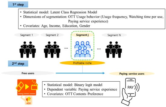 Second, after identifying the meaningful segment, the so-called profitable niche market, we evaluate how OTT content preferences influence the paid service experience by applying the binary logit model to the identified profitable niche market. This will guide OTT platform companies on the kind of content they should invest more in. Figure 1 provides a simple depiction of the research framework of this study.