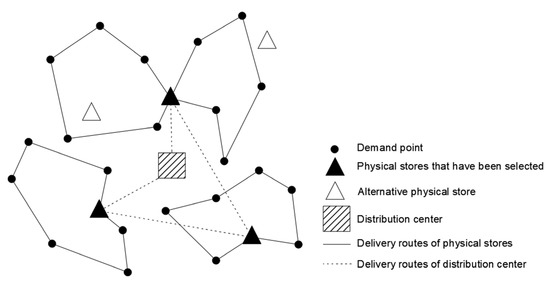 This paper considers the online retail enterprise that plans to implement the BOPS omnichannel retail model. According to the previous relevant statistical data, it divides all customers in the distribution area of a distribution center into several demand points. Based on different customer choice behaviors with regard to demand points, it constructs an offline physical store location model with the minimum total cost and optimizes the distribution route. Offline physical stores, together with distribution centers and demand points, form a two-level distribution logistics network while meeting customers’ demands in the offline physical channel and BOPS channel, as shown in Figure 1.