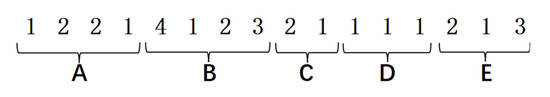 The coding structure of the chromosomes is shown in Table 3. Each chromosome consists of five gene fragments. Gene fragment A has digit, which randomly generates natural numbers from 1 to , representing the matching relationship between demand points and small delivery vehicles. and are the total number of demand points and the number of small delivery vehicles, respectively. Gene fragment B also has digit, which is a random number arrangement from 1 to , representing the service order of demand points. Gene fragment C has digit. It randomly generates natural numbers from 1 to , where the number of genes that are not duplicated is less than or equal to , representing the corresponding relationship between small delivery vehicles and alternative physical stores. is the number of alternative locations of physical stores, and is the limitation in the number of physical stores. Gene fragment D has digit, which randomly generates natural numbers from 1 to , representing the assignment relationship between physical stores and large delivery vehicles. is the number of large delivery vehicles from the distribution center to physical stores. Gene fragment E also has digit, which is a random number arrangement from 1 to , representing the service order of physical stores. Set the population size, and then randomly generate individuals in the population according to the coding rules.