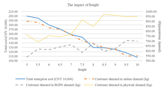 As can be seen from Figure 4, with the increase in freight level, the total enterprise cost tends to decline, and customer demand in the online channel gradually decreases, while customer demand in the BOPS channel and offline physical channel generally shows an upward trend. The lower the demand for the online channel, the lower the logistics and distribution cost of the enterprise, and the lower the penalty cost of return, thus reducing the total enterprise cost. It can be concluded that the higher the freight level set by the enterprise, the more customers’ demands in the online channel will be transferred to the BOPS channel and the offline physical channel, which is conducive to reducing the total enterprise cost.