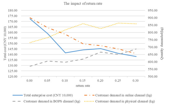 Assuming that the average return rate of each demand point is the same, we set the average return rate of a demand point to increase from 0 to 0.3 in steps of 0.05. Figure 5 shows the results of solving the total enterprise cost and customer demand in the three purchase channels at each level of return rate.