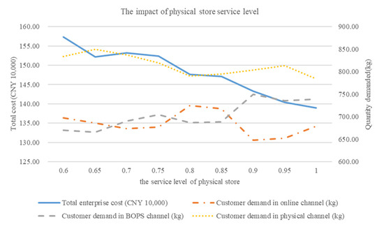 As can be seen from Figure 6, with the improvement of the physical store service level, customer demand in the BOPS channel generally shows an upward trend, while the total enterprise cost generally shows a downward trend, and customer demand in the physical channel always remains the highest. It can be concluded that improving the service level of a physical store can attract more customers to purchase products through the BOPS channel, which is conducive to reducing the total enterprise cost.