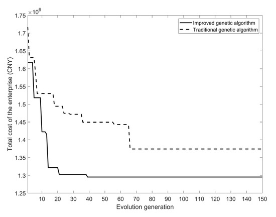 Figure 7 shows that the improved genetic algorithm has a faster convergence speed and higher optimization efficiency. It can be seen from Table 9 that the optimal total cost and average total cost obtained by the improved genetic algorithm are low, the standard deviation of the solution results is small, and the average running time is also significantly reduced. Therefore, the improved genetic algorithm used in this paper is effective and can be used to solve such problems.