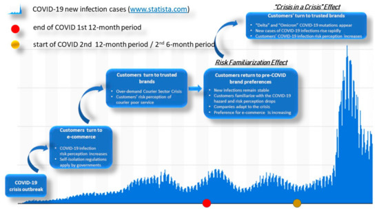 Independent sample t-test outcomes suggested that e-customers familiarization with the COVID-19-related risks resulted in significant changes to their purchasing behavior regarding brand preferences, driving them to behave in a “non-COVID” pattern. However, when new infection cases demonstrated an intense increase, e-customers responded to the crisis escalation by shifting their preferences to more trusted brands, although they were familiarized with the crisis-related risks. This effect could be described as a “crisis within a crisis effect”.