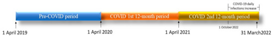 For our study, we defined three time periods of one year each (Figure 2). We specified the 1st of April 2020 as the starting date of our study period because most effects of the pandemic had already settled in since most countries had applied border control laws and self-isolating policies for almost one month. The first period (1st of April 2019 to 31st of March 2020) represented the year before the COVID-19 pandemic (pre-COVID period). The second period (1st of April 2020 to 31st of March 2021) signified the first year of the COVID-19 pandemic (COVID 1st 12-month period). The third period (1st of April 2021 to 31st of March 2022) denoted the 2nd year of the COVID-19 pandemic (COVID 2nd 12-month period). For the investigation of H4 we also highlighted the last 6-month period of our timeline where the COVID-19 daily infection cases spiked.