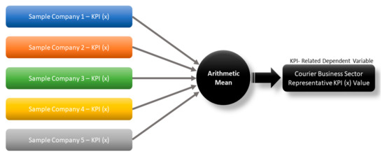 To achieve more efficient data processing and statistical analysis, we collected every KPI value from the sample companies and formed a representative KPI-related variable based on the average value. An arithmetic mean value was chosen in order to simulate the behavior of an average company representing the highest percentage of market capitalization in the courier companies’ sector. Additionally, this process (Figure 3), applied to all seven KPIs, allowed us to compare our results with studies that have used similar methodologies [20,69,76].